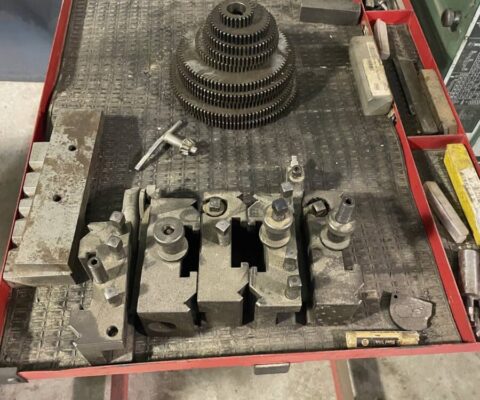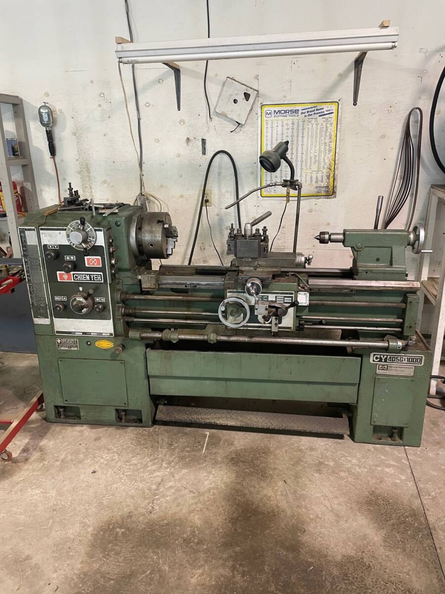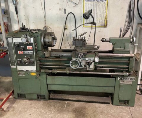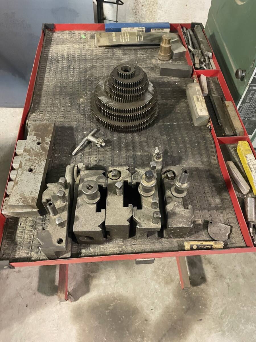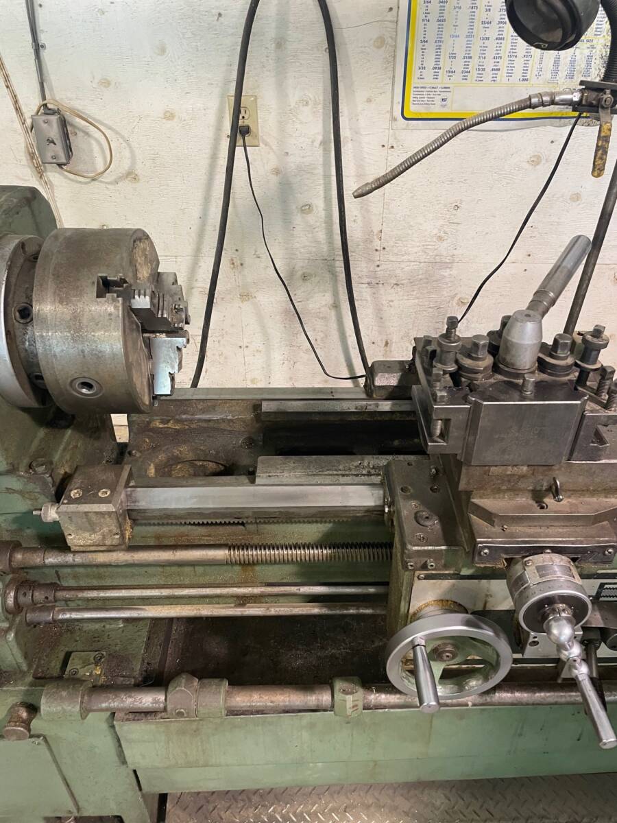 16″ x 40″, 9.625″ o/c, 23.375″ in gap, 12″ bedwidth, 80- 2000 rpm, 2″ bore, 7.5 HP, 550/3/60. c/w 10″ 3- jaw, chuck, 4- way toolpost and holders, footbrake.
